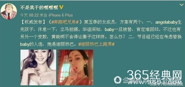 这不最近某知名制片人在微博爆料说:跑男第五季的女成员,方案有两个,一是baby生完孩子,休息一下,立马拍摄。二是节目组已经在考虑替换baby的人选,她是迪丽热巴。