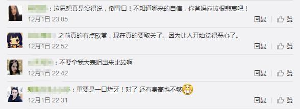下面左边是刘雯大表姐,右面是西红士。网友回应西红士说:不要拿我大表姐来比较啊。重要是一口烂牙!对了还有身高也不够。
