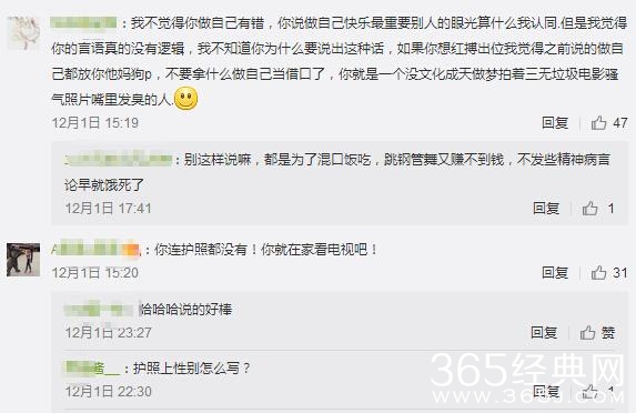也有网友看照说:我不觉得你做自己有错,你说做自己快乐最重要别人的眼光算什么我认同.但是我觉得你的言语真的没有逻辑,我不知道你为什么要说出这种话。也有网友说:你连护照都没有!你就在家看电视吧!