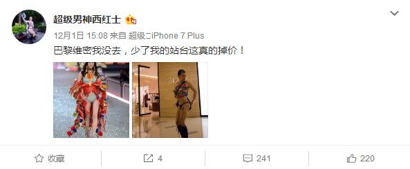 西红士爆照说:巴黎维密我没去,少了我的站台这真的掉价!网友回应说:不要丢面,丢到外国去,老是想占便宜,先把你得獠牙打爆再说。