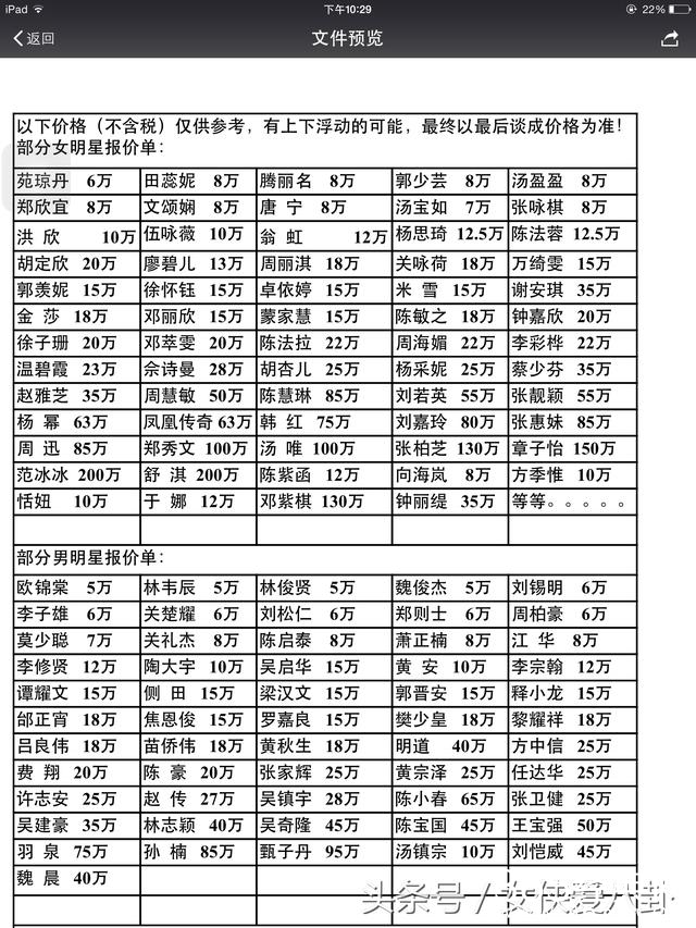 其实从报价里多多少少可以看出来,明星当红,过气,一线地位等等。不过粉丝们也不要太在意,毕竟这只是一份商演报价单,尚且不论它的真伪,并不影响你们爱他们。