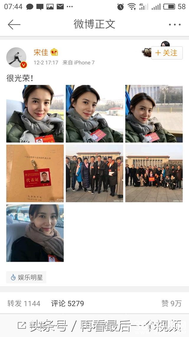 昨天宋佳微博晒出几张参加文联代表大会的图片,并表示很光荣。