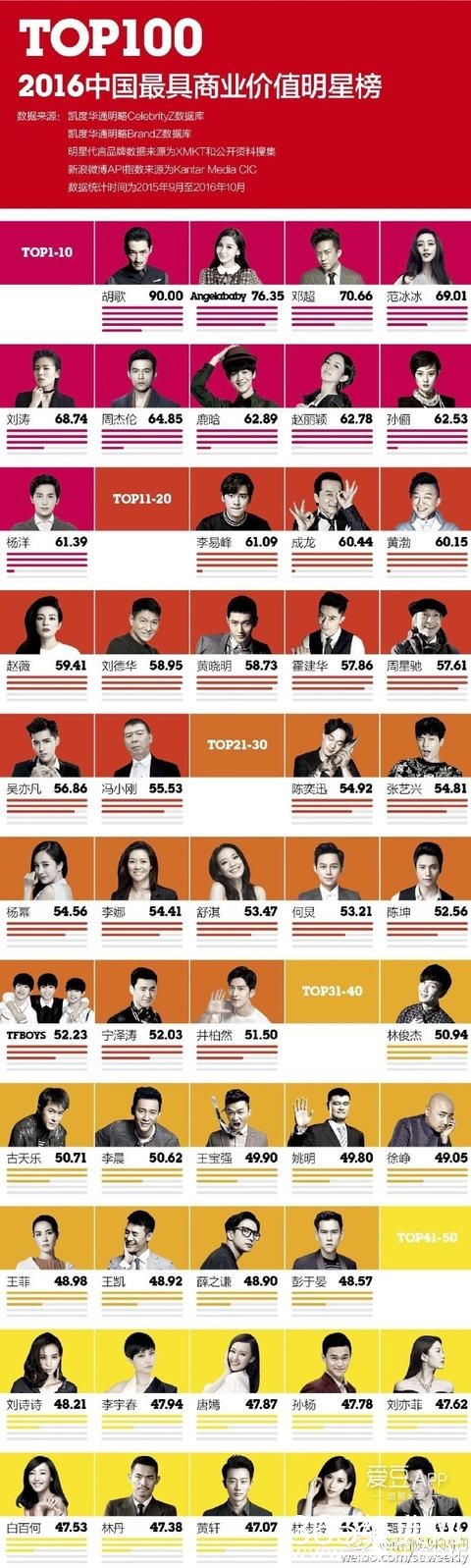 爱豆新闻讯 11月2日,《第一财经周刊》大数据评出2016中国最具商业价值明星榜TOP100,鹿晗以62.89分紧随周杰伦之后位列第七,成为90后小生的首位。