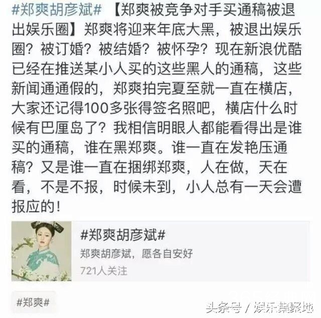 郑爽真的是当之无愧的热搜女王。。。前几天十八线小明星爆料古力娜扎插足郑爽张翰,郑爽上热搜,而现在郑爽又上了热搜,说她已经和胡彦斌订婚,怀孕,甚至郑爽要退出娱乐圈?