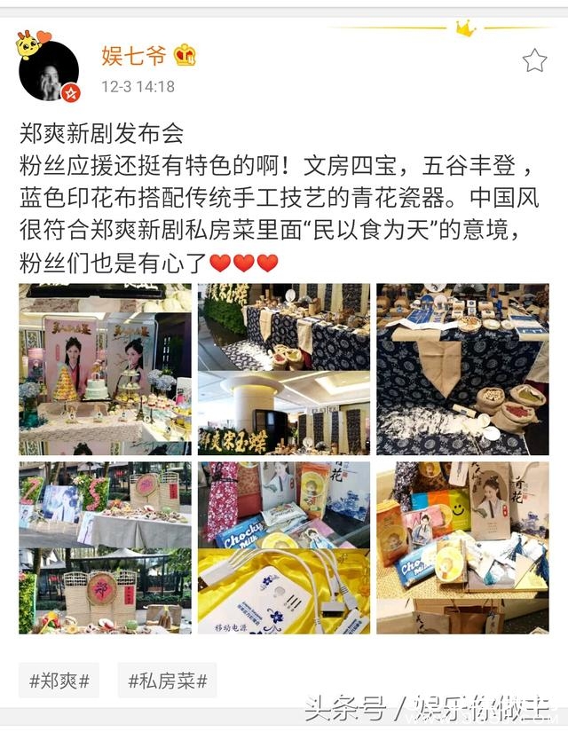 据@娱七爷爆料,郑爽新剧发布会上,粉丝的应援琳琅满目,不仅有文房四宝,更有五谷丰登。各种应援物颇有古风的感觉。为了贴合新剧《美人私房菜》,粉丝可以费尽了心机啊!