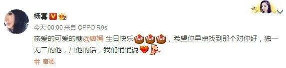 杨幂在微博写道:“亲爱的可爱的糖唐嫣生日快乐,希望你早点找到那个对你好,独一无二的他,其他的话,我们悄悄说。”不仅送上生日祝福,还为闺蜜的另一半操心。虽然之前两人也有感情破裂传闻,但真正的闺蜜是通过实际行动做出来的,从这点看,两人感情还是不错的。