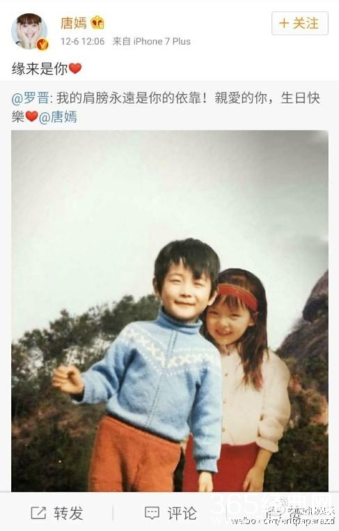 6日,@罗晋 晒出与@唐嫣 的旧照P图,配文:“我的肩膀永远是你的依靠!亲爱的你,生日快乐!@唐嫣 ”。