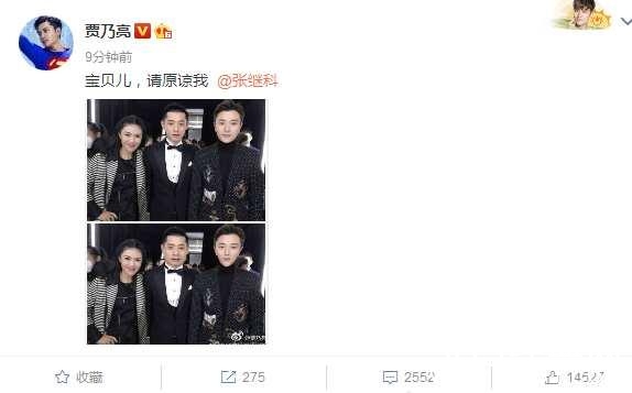 12月7日,贾乃亮在微博中晒出和张继科的合影,照片中,原图非常正常,在下面的照片中,贾乃亮将自己p成了尖下巴的网红脸,撞脸刘梓晨,而把张继科p成了国字脸,贾乃亮称:“宝贝儿,请原谅我”