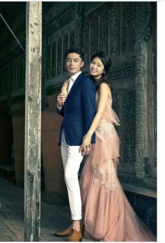 同样也是婚纱照,林心如穿着粉色长裙,霍建华则是一身帅气西装。心如依偎在霍建华身后,彼此之间十指紧扣,隔着屏幕都可以感受林心如发自内心的满满幸福感。