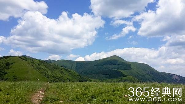 经大家商量后决定放弃原本路线,原路返回,虽然销魂坡难走,但是路线最近,没法子只好这样了,我和小丹尼依旧合作中,她前我后,路上下过雨泥泞不堪,踩着草地努力加紧速度前进,过了会雨渐渐不下了,但风依旧很凉,回到了我们中午吃饭的地方,修整了一番后,在嗷山的建议下,大家从阎家坪下山,路线虽然有点远,但安全没问题,飞城两年前走过,所以这次还是飞城探路,琳子、飘雪和我一路紧随其后,不过飞城走的是真快,我们仨一路走一路用手机照了些照片,前也没人后也没人,就看着这一片上下起伏的绿,心情怎一个舒畅了得,后来慢慢田田同事和发条鸟也赶上来了,飞城会在前面等我们一下,我们几个脚程还不算慢,一直跟的挺紧,路走的快了就不觉得累了,反而觉得很兴奋,好久都没走的这么舒服过了,肺活量好像都增加了不少,偶尔回头时飞城和中队嗷山对讲机联系,看到几个小点在山间起伏,心里超级有成就感啊,看到公路后我们在一个山头上等中队和后队,飞城包里还有两个香瓜,我们6个分了一个,剩下的留给他们,等大家赶到后,一个个累的在地上歇了会,过会出发上路,后面基本上就没有大山包了,小幅上下后看到了山下一堆的车,看来今天往返的人不少啊,