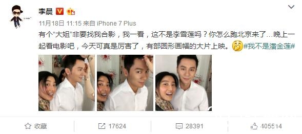 大黑牛李晨曾在在微博晒出一组与“李雪莲”的合影。并发文道:“有个‘大姐’非要找我合影,我一看,这不是李雪莲吗?你怎么跑北京来了,晚上一起看电影吧,今天可真是厉害了,有部圆形画幅的大片上映。”