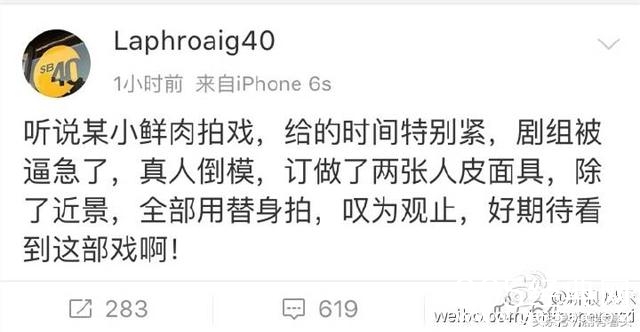 昨晚有人爆料说某小鲜肉拍戏用真人倒模,做了人皮面具贴在替身身上,除了近景,全部用替身!