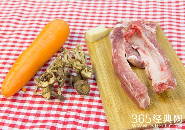 食材清单:排骨400克、茶树菇150克、胡萝卜1个、猪鲜宝适量、料酒适量、生姜适量、盐适量。