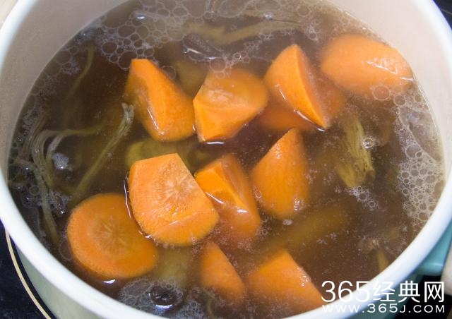 5、炖了3个小时之后,打开锅盖,倒入胡萝卜,搅匀,然后盖上锅盖继续炖1个小时。