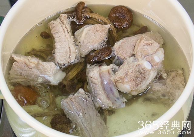 4、倒适量清水入锅(水量可以根据人数来决定),放入姜片、茶树菇和排骨,盖上锅盖,大火炖4个小时。(要炖足4个小时,这样排骨中的营养成分才会充分炖出来。)