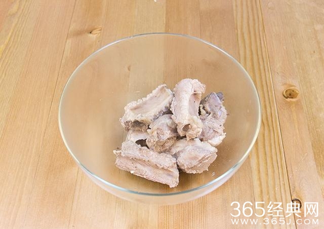 1、排骨洗净斩块,放入热水中氽烫5分钟,去除排骨表面残留的血水和肉腥味。(在热水中加少许料酒,可以很好地去除排骨的肉腥味。)