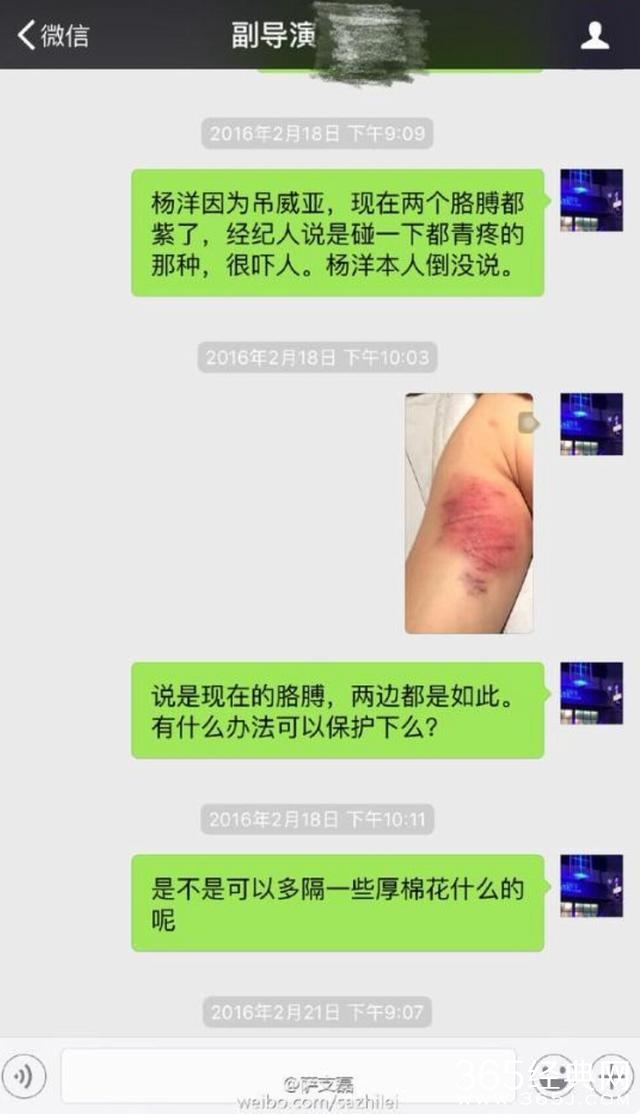 微博上还流传着某负责人的聊天截图,称杨洋因为吊威压两个胳膊都肿了,还有伤处特写: