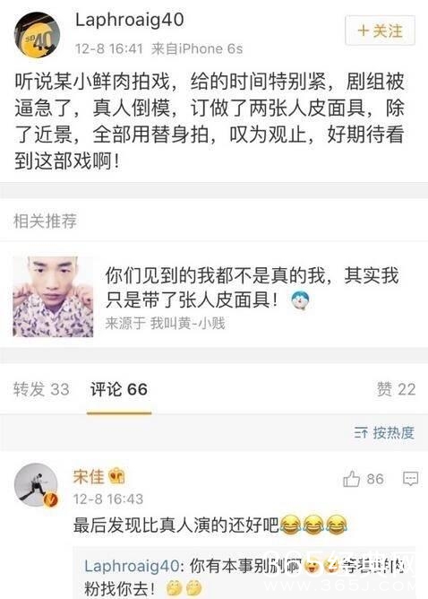 业内人士La的一条微博可谓一石激起千层浪。这某小鲜肉拍戏做真人倒模、用人皮面具和替身本就够劲爆了,演员宋佳还对此进行了评论,可谓是火上浇油,更增加了事件的真实性。