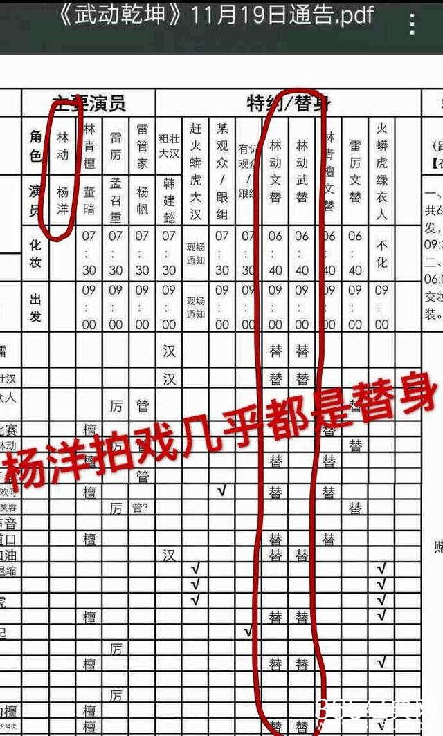 同时网上晒出了各种杨洋用替身的证据,比如《武动乾坤》剧组通告单: