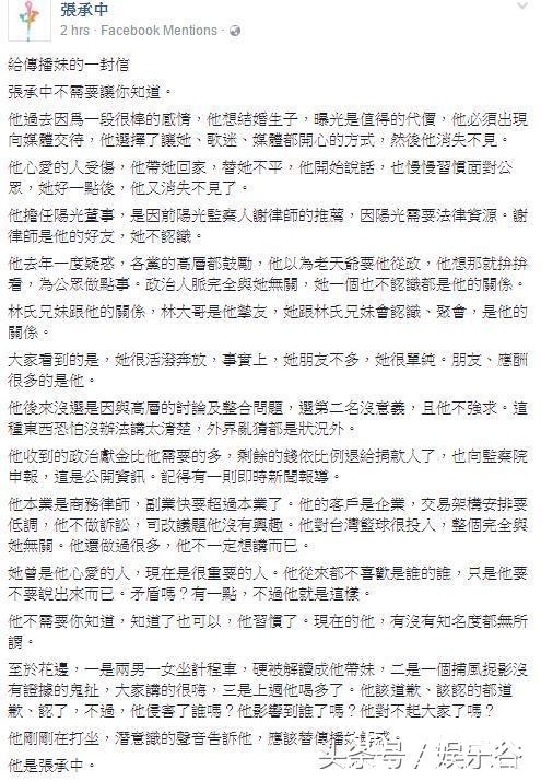 于是张承中就发了长文开始撕Selina的粉丝,张承中用长文反驳透露前妻Selina虽活泼奔放,但其实朋友不多(潜台词Selina并没有帮到自己),主要都是自己应酬居多。然后说自己原来和林志玲两兄妹是好朋友,而不是Selina介绍所认识的,还说自己不需要有知名度的。