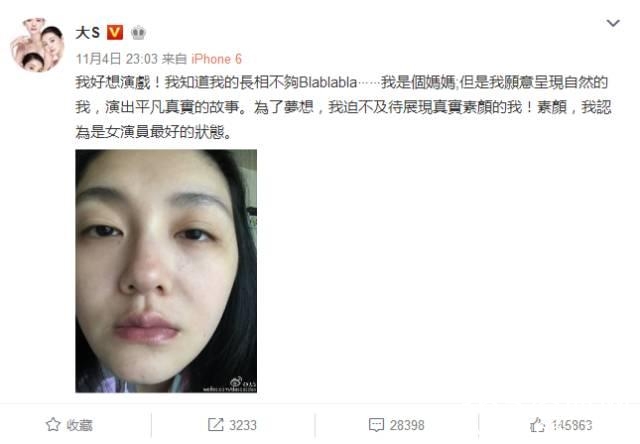 大S先是在微博上发了消息,说自己现在好想演戏,为了梦想,迫不及待展现真实素颜的我。素颜,我认为是女演员最好的状态。