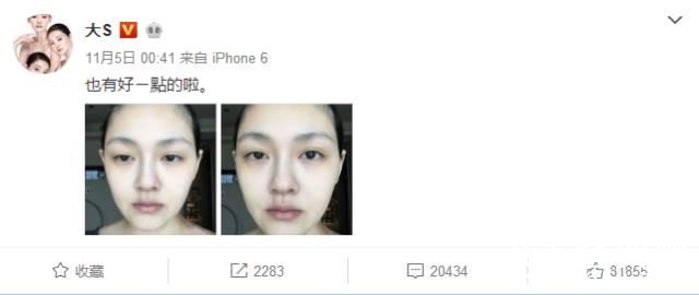 可能是被粉丝指这张自拍实在有点鬼畜,隔天大S又发了一条微博,表示我也有好一点的素颜照。