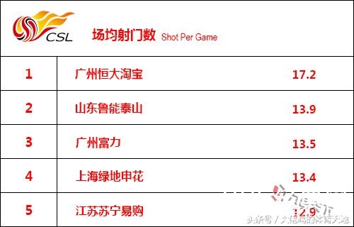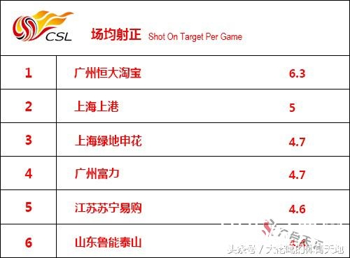 恒大的场均射正次数达到6.3次,排名第二的上港场均相差1.3次,是一个不小的差距,恒大在本项统计中依然傲视群雄。