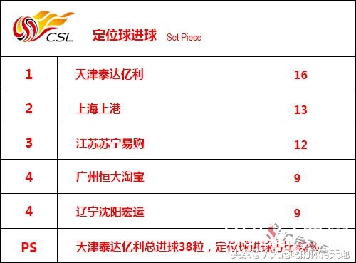 不说不知道,原来恒大也依靠定位球打进了9个进球,在联赛中排名第4,说明恒大的进攻还是比较立体的,不只是单纯依靠地面配合。不过也要留意到,恒大的主要竞争对手上港和苏宁的定位球进球数有13个和12个,下赛季再与这两队交战时一定要小心防备他们的定位球。