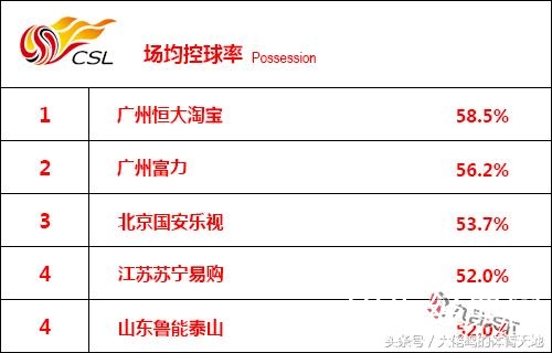 本赛季获得冠军的恒大在此项数据中雄踞榜首,场均控球率高达58.5%,同样擅长打传控战术的富力排名第二,但与恒大还是有2.3%的差距。