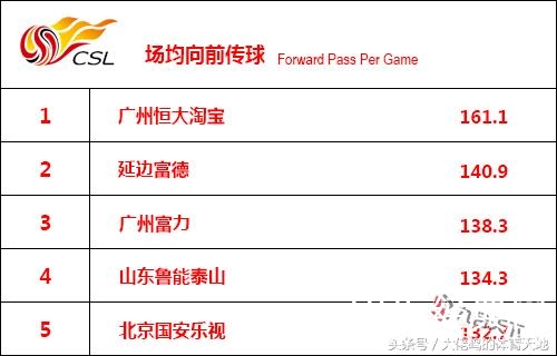 场均向前传球表现了球队在整体控制下进攻的欲望和能力,恒大场均领先第二名约20次传球排在了榜单第一名,可以看出恒大的整体进攻能力在中超依然是首屈一指的。