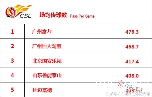 场均传球数在一定程度上代表着球队的风格,在传球数Top5排行榜上的五支球队都是偏向传控风格的球队,其中富力排行第一,排名第二的恒大淘宝与富力相差不多,展现了强大的控制力。