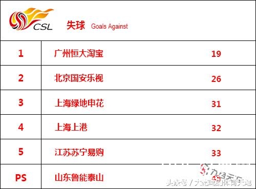 被射门次数少,失球数当然就会越少,恒大本赛季30场联赛只失了19球,场均失球数仅为0.63个,当仁不让地排在这项数据统计的首位!