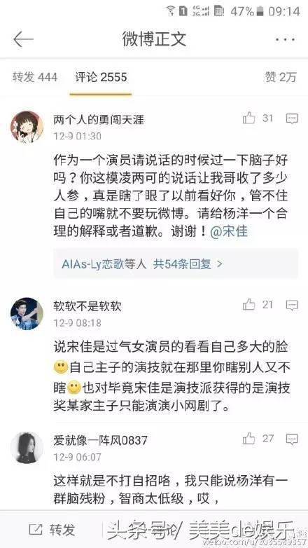 杨洋不敬业用替身等话题仿佛是要铁了心跟着杨洋一样,虽然拍戏这些事我这个吃瓜群众不是怎么懂,但是我只知道这次小宋佳的评论一定会被羊毛们包围的这我是肯定的,所以以后说话还是得三思啊。不知道各位吃瓜群众怎么看待杨洋这件事呢?