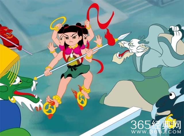 手拿混天绫脚踩乾坤圈,三头六臂威风无比