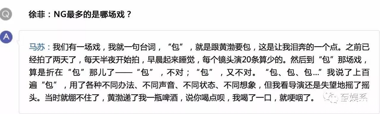 当被问及作为宁浩老同学是否受到优待时,马苏说:「我觉得受到的优待就是严格。这次拍摄宁浩导演发掘了我身上一些与众不同的特质,之前我拍电视剧都演些正面人物,但他特别大胆,让我演了跟平时生活中反差极大的女性,在表演的细节、层次上帮我抠戏,都很难得。」