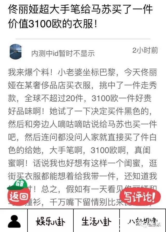 两个人好到什么程度呢?根据关八爆料,佟丽娅去巴黎的时候眼睛都不眨地给马苏买了件好几千欧的衣服!上升到金钱的爱绝壁是真爱啊~
