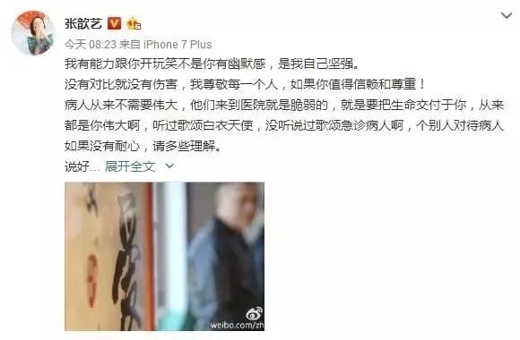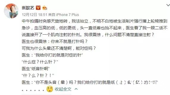 大概意思就是张歆艺头晕去医院,医生二话不说就给她打止晕针,也没有问清病因巴拉巴拉的。