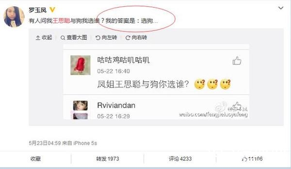 凤姐当年直言在王思聪和狗之间选,她会选狗。寓意王思聪狗都不如,有点强悍。