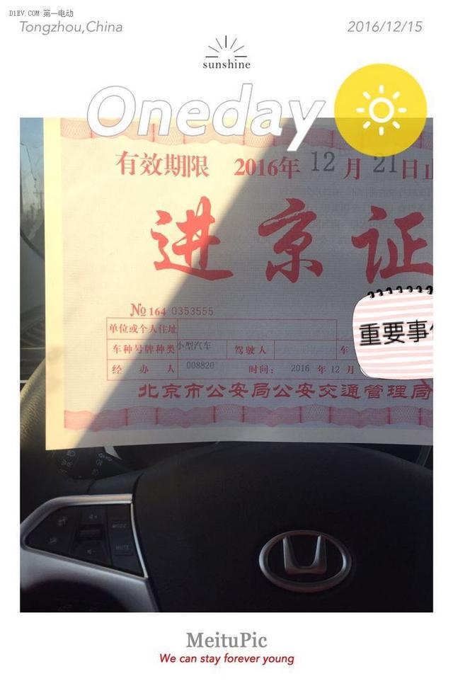 终于等到了电话,接到指示可以出发了,向着大北京走起!我们俩开着小车唱着歌,夕阳下的进京证也更漂亮了呢!进京证后面的文字也更美好了呢!