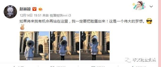 赵丽颖昨晚(12月14日)发了一组自拍称:如果将来我有机会再站在这里,我一定要把脸露出来!这是一个伟大的梦想。