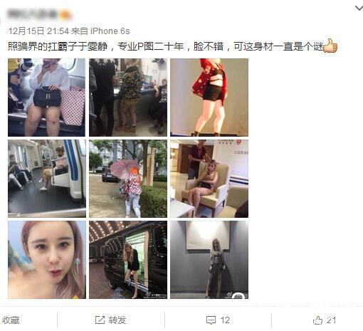 网友爆料网红于雯静的“照骗”,还称她为网红界的扛霸子,脸蛋不错,然而身材却是个迷。网友看照回应说:神奇的是p身材,周围竟然都不歪。