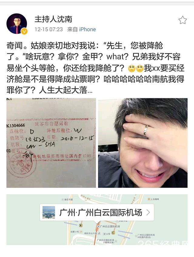 今日(12月15日),主持人沈南(就是金星秀中和金星搭档的那位)遇到了这样一件“奇闻”(用他自己的话是这样说的)的事情,原话是这样的:奇闻。姑娘亲切地对我说:“先生,您被降舱了。”啥玩意?拿你?金甲?what?兄弟我好不容易坐个头等舱,你还给我降舱了?我XX要买经济舱是不是得降成站票啊?哈哈哈哈哈哈南航我得罪你了?人生大起大落。。。