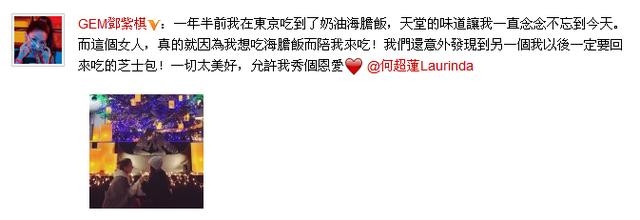 邓紫棋还留言赞贴心的超莲知道她要吃海胆饭,陪她飞到东京:“一年半前我在东京吃到了奶油海胆饭,天堂的味道让我一直念念不忘到今天。而这个女人,真的就因为我想吃海胆饭而陪我来吃!我们还意外发现另一个我以后一定要回来吃的乳酪包!一切太梦想,允许我秀个恩爱。”
