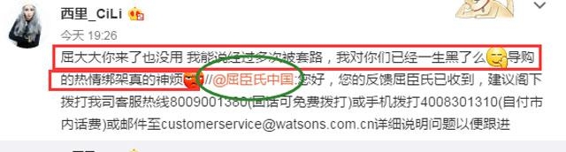西里把这件事发到微博上之后,屈臣氏中国的官网也回复她了,但是太官方了,而西里就说什么“屈大大你来了也没用....我对你们已经一生黑了”