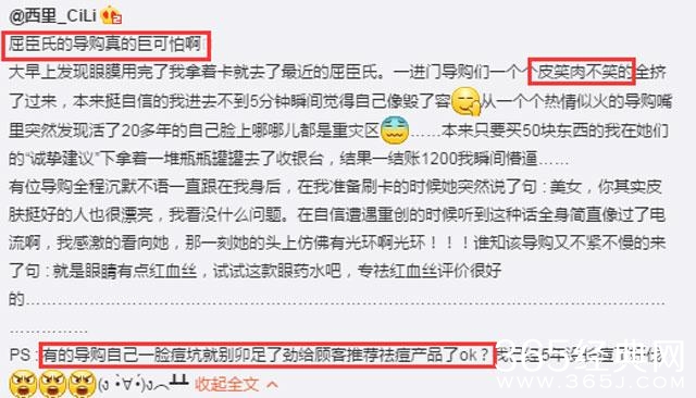 西里还称有的导购自己一脸的痘坑还卯足了劲给顾客推荐祛痘产品。对这这种情况,其实大部分心中都会呵呵哒的。