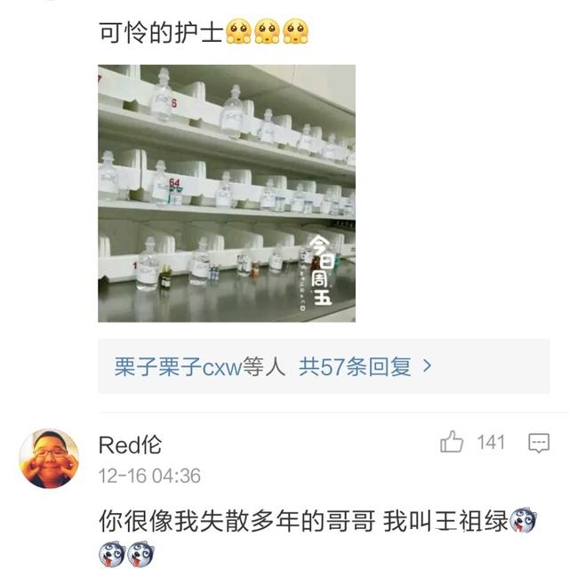 又是一个白衣天使,还有一个不正经的网友,说,你很像我失散多年的哥哥,我叫王组绿。