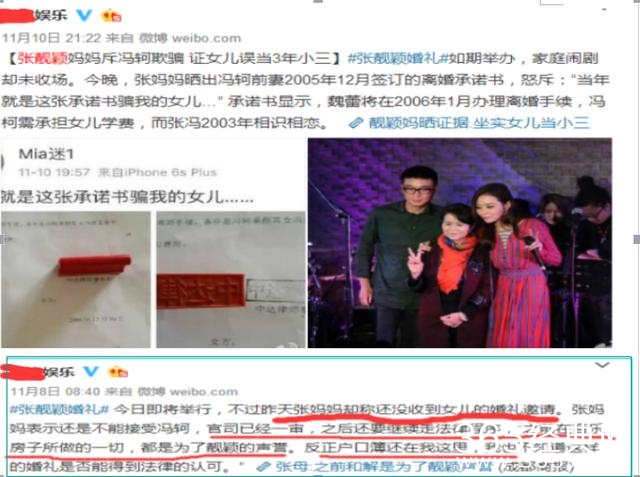 在张靓颖婚礼上面冯柯没有请张靓颖的妈妈,张妈妈也未出现在自己女儿的婚礼上,甚至在张靓颖结婚当天都不知道时间还说跟新郎冯柯有官司在打。