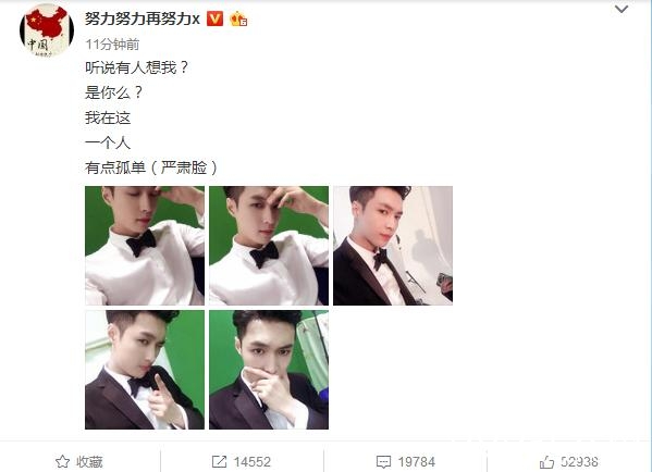 12月16日晚张艺兴更新微博称:听说有人想我?是你么?我在这一个人 有点孤单(严肃脸)。