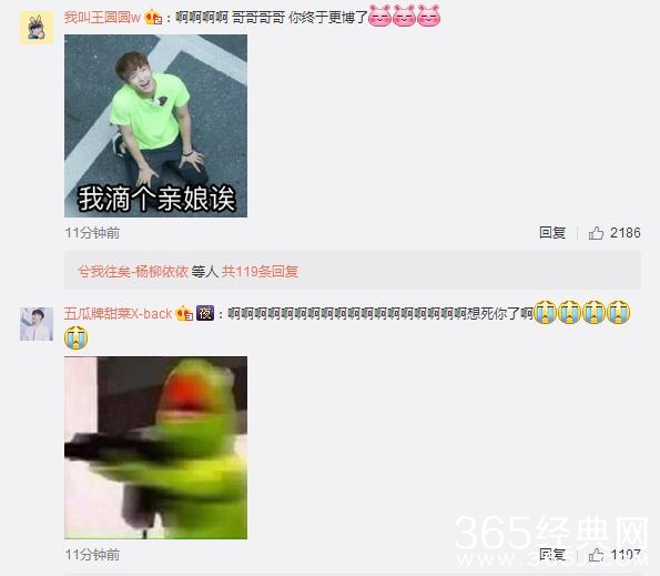看到张艺兴更博,大批网友十分激动。而且在评论区放了很多张艺兴的表情包表达心情,像这样的:
