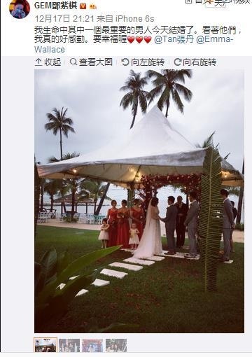 17日晚,邓紫棋微博更新内容:我生命中其中一個最重要的男人今天結婚了。看著他們,我真的好感動。要幸福@Tan張丹@Emma-Wallace